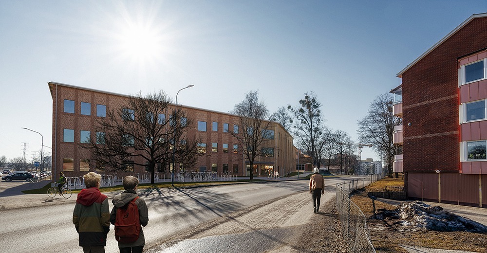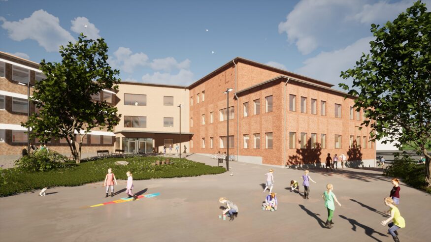 Den första designen föreslog att två byggnadskroppar skulle rivas och ge plats åt skolans nya del. När vi omvärderade förutsättningarna visade det sig att en annan placering av den nya delen möjliggjorde att vi kunde spara de blev det tvärtom bättre att spara de två byggnadskropparna. På så sätt minskade vi klimatpåverkan avsevärt, eftersom grundläggning och stomme är de moment som har störst klimatpåverkan.