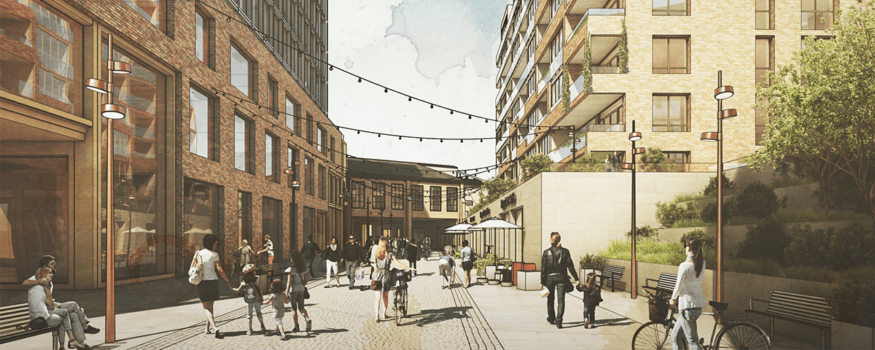 Här skapar vi en modern, öppen och attraktiv stadsdel, centralt i en stad som växer, med både citykänsla och hemtrevlig charm.