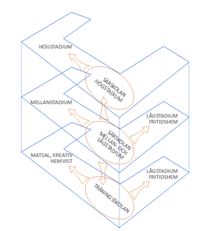 Eleverna kan få den bästa möjliga individuella undervisningen, antingen i särskolans egna, avskilda lokaler eller i skolans övriga lokaler. Särskolans stadium är alltid granne med grundskolans respektive stadium, för att lätt kunna hitta synergier både i den fysiska miljön och i den organisatoriska strukturen. Hela byggnaden är tillgänglig för elever och vuxna med fysiska funktionsnedsättningar, men även för elever med NPF (neuropsykiatriska funktionsnedsättningar). Dova färger, god orienterbarhet i byggnaden och mångfald av olika miljöer ger stöd för alla.