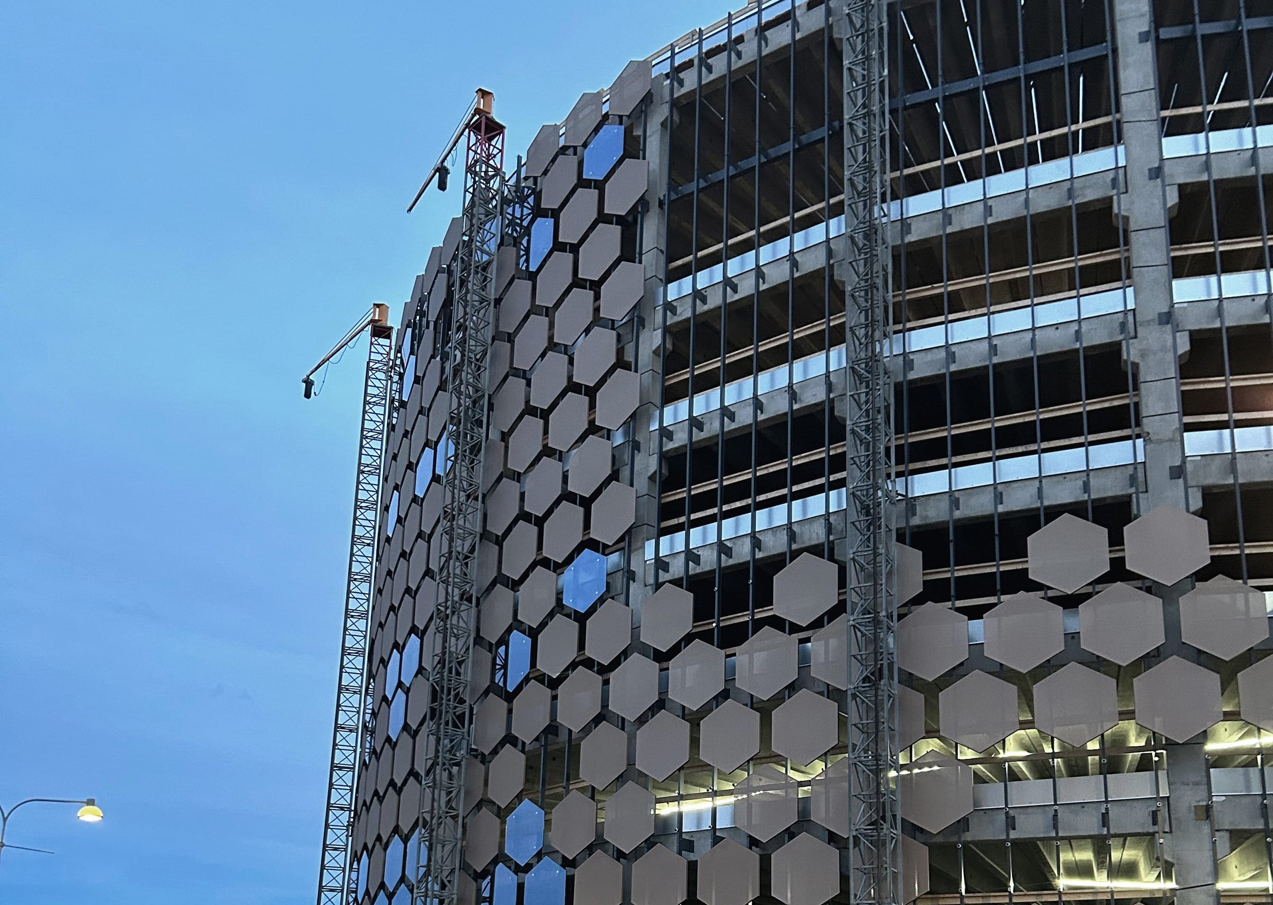 Just nu pågår montaget av 2162 stycken hexagoner på fasaden till det nya mobilitetshuset vid Signalbron i Solna.