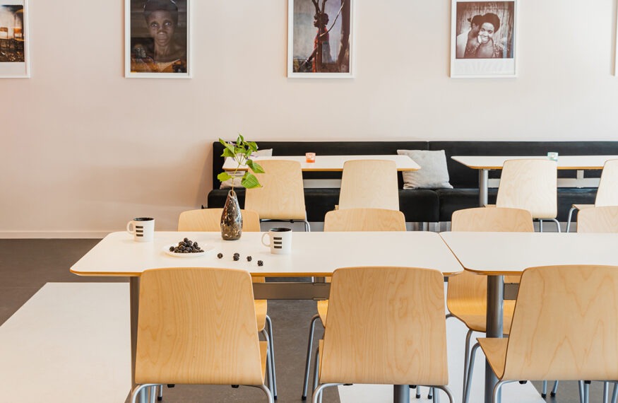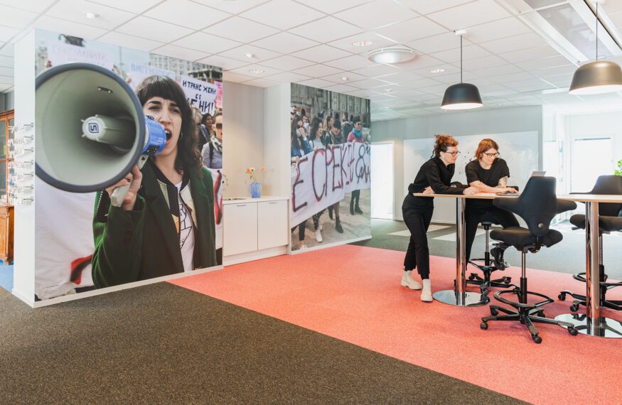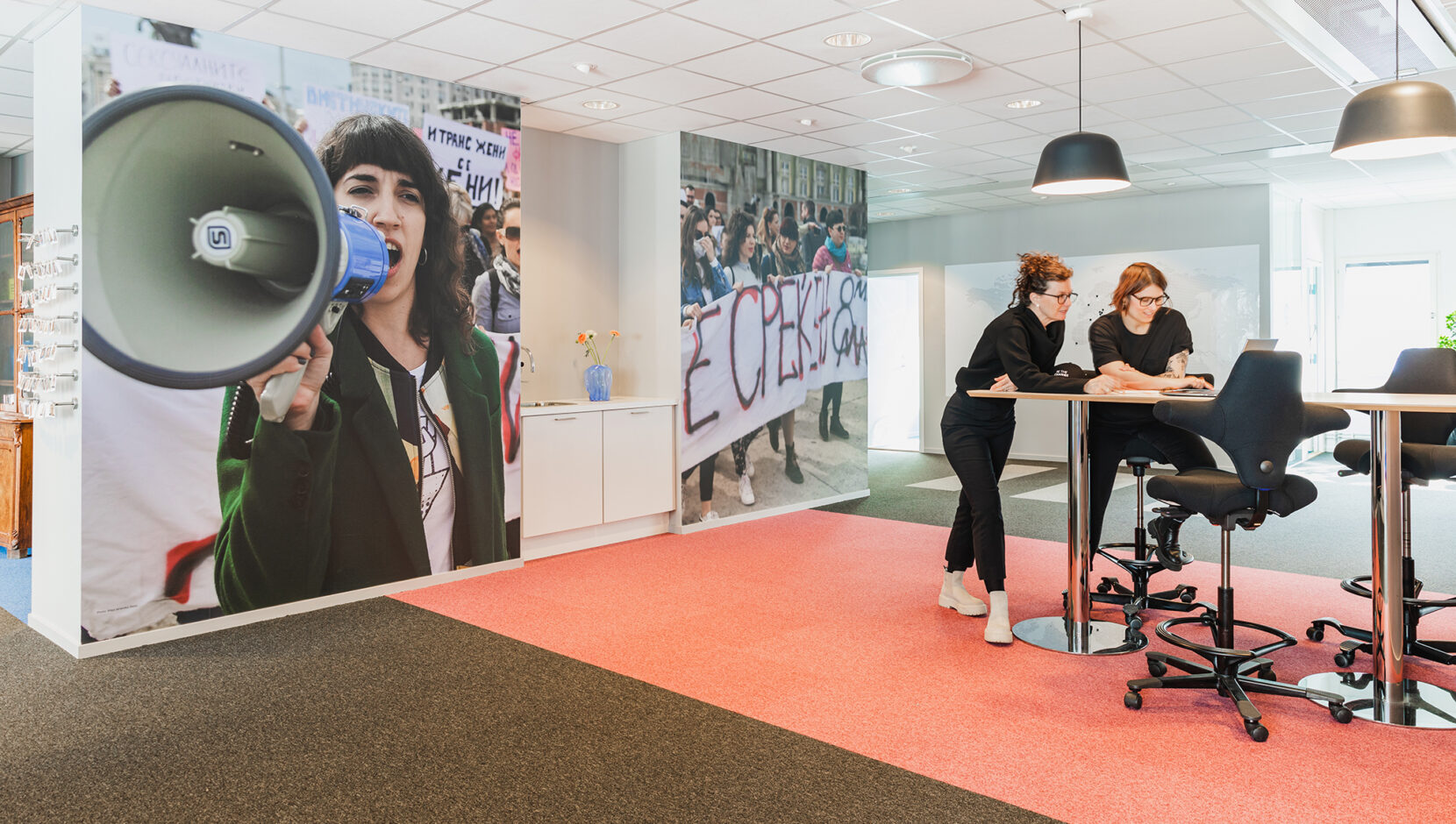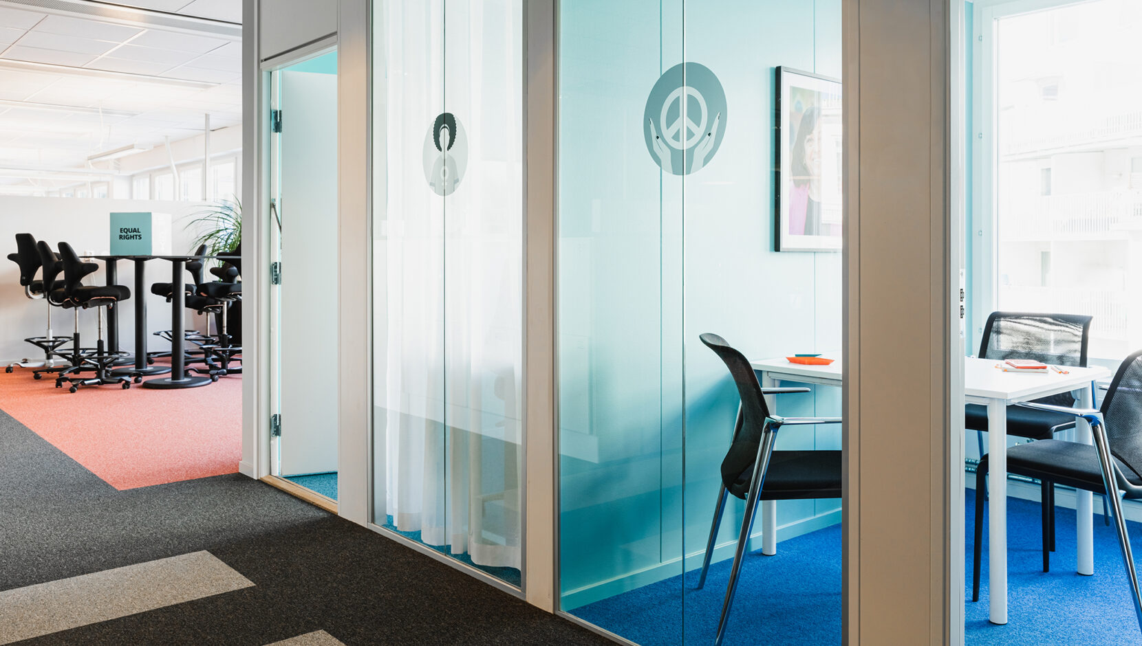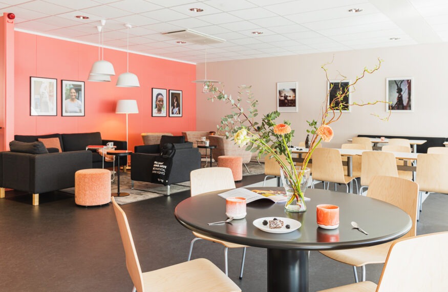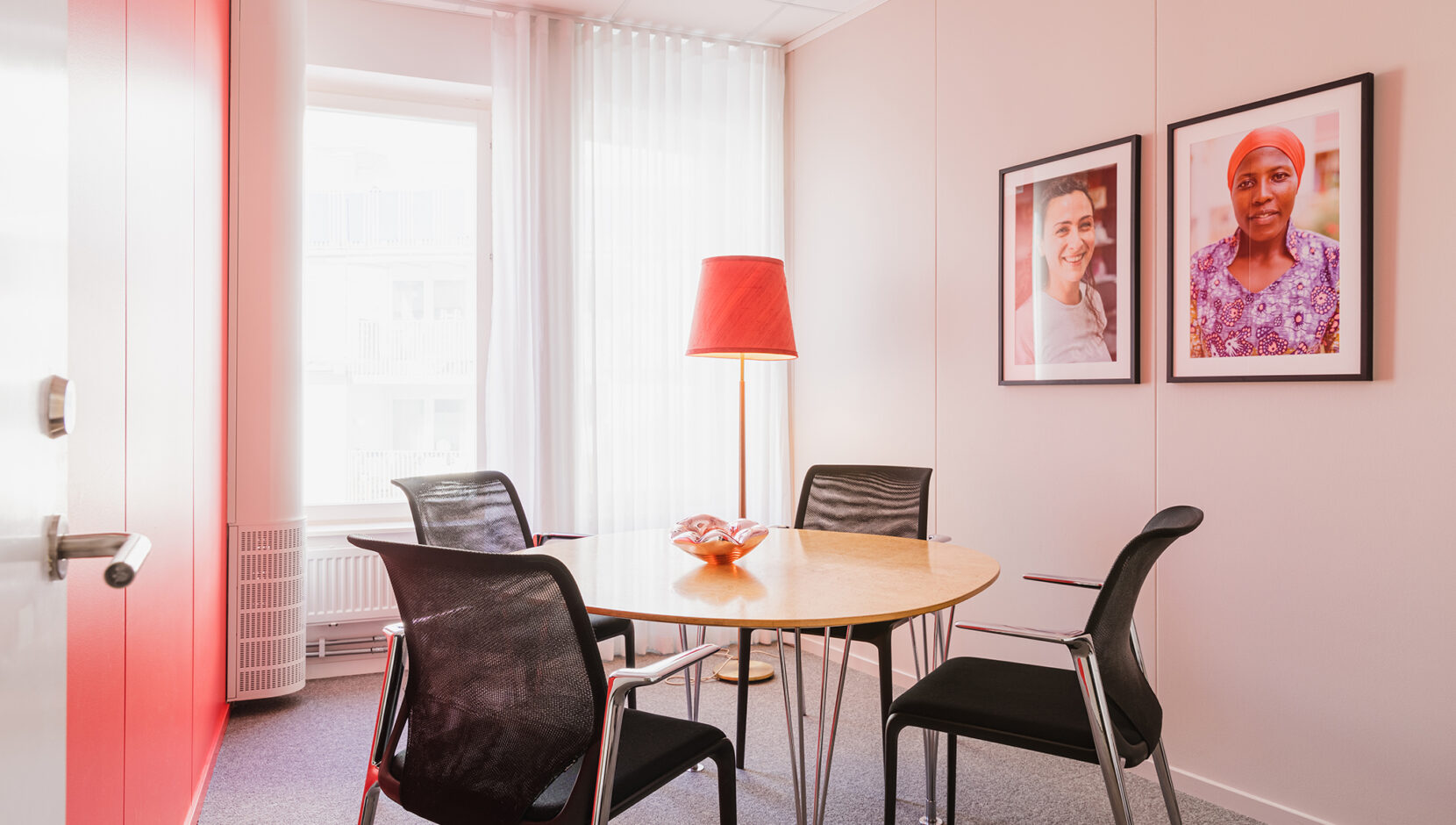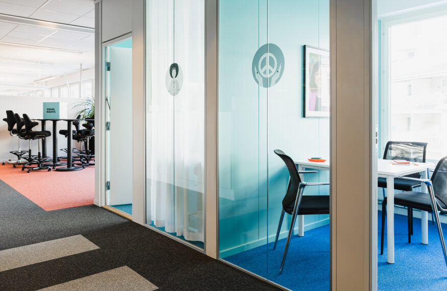 Lokalen utformades med många flexibla lösningar, för att stötta deras arbetssätt och ge nya möjligheteter till möten, samarbeten med nära kollegor så väl som besökare från hela världen. En modern välkomnande och färgstark färgsättning kopplat till vision, varumärke och Kvinna till Kvinnas starka kamp mot kvinnors rättigheter.