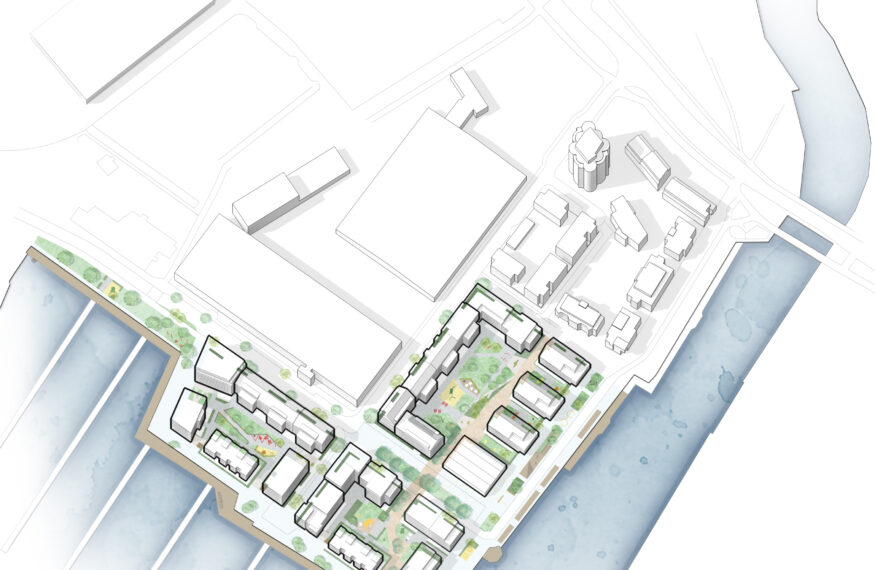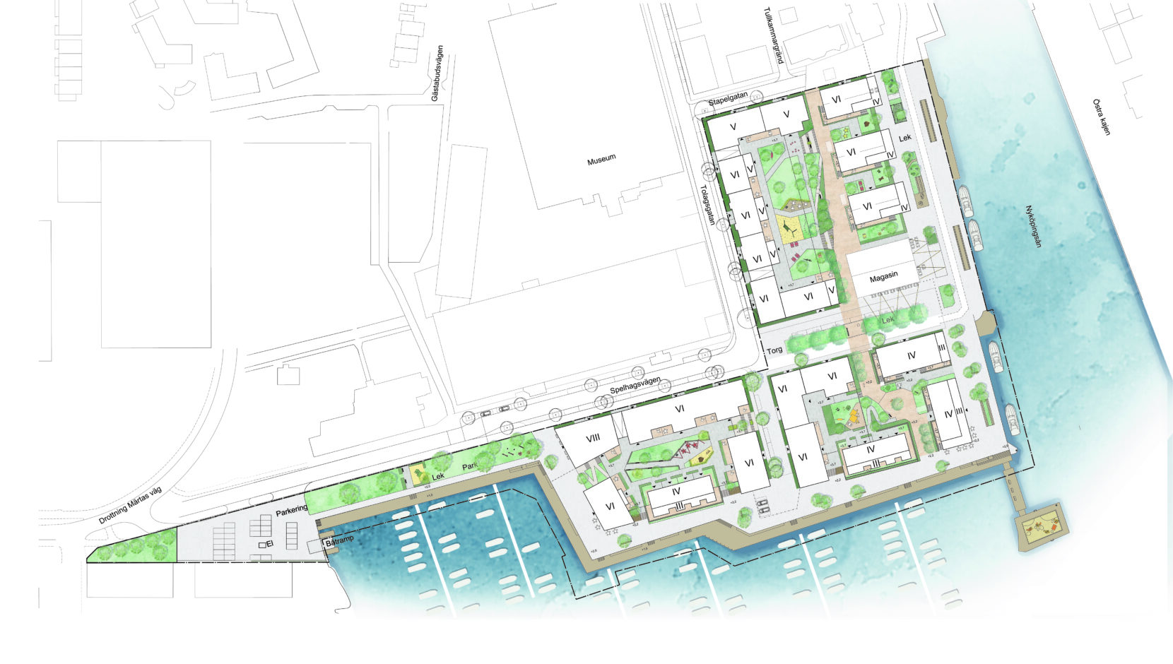 Planområdet utvecklas med tre nya kvarter. De nya kvarteren blir Nyköpings front mot fjärden och samspelar med ny såväl som äldre bebyggelse. De breda gaturummen som utmärker området förblir bevarade i sin struktur. Kvarteren hålls öppna och inbjudande med utblickar mot vattnet för både boende och besökare. Ett halvoffentligt gårdsstråk binder samman kvarteren och möjliggör passage genom bostadsgårdarna. Det befintliga magasinet får nytt innehåll och blir en identitetsbyggnad för området, som berättar om tidigare epoker.