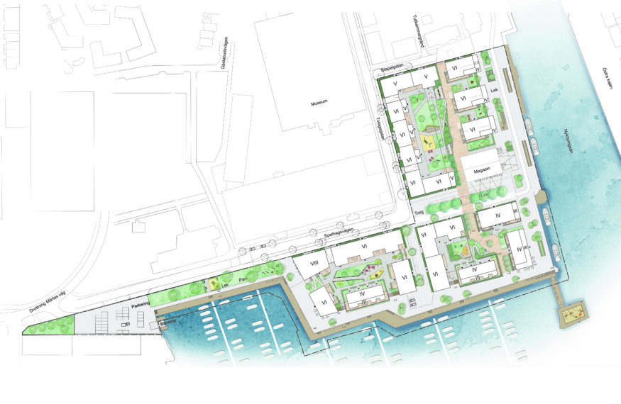 Centralt, vackert och sjönära är förutsättningarna för planområdet i Spelhagen i Nyköping som kommer att förvandlas från rådande kajparkering till ett stads- och havsnära bostadsområde.