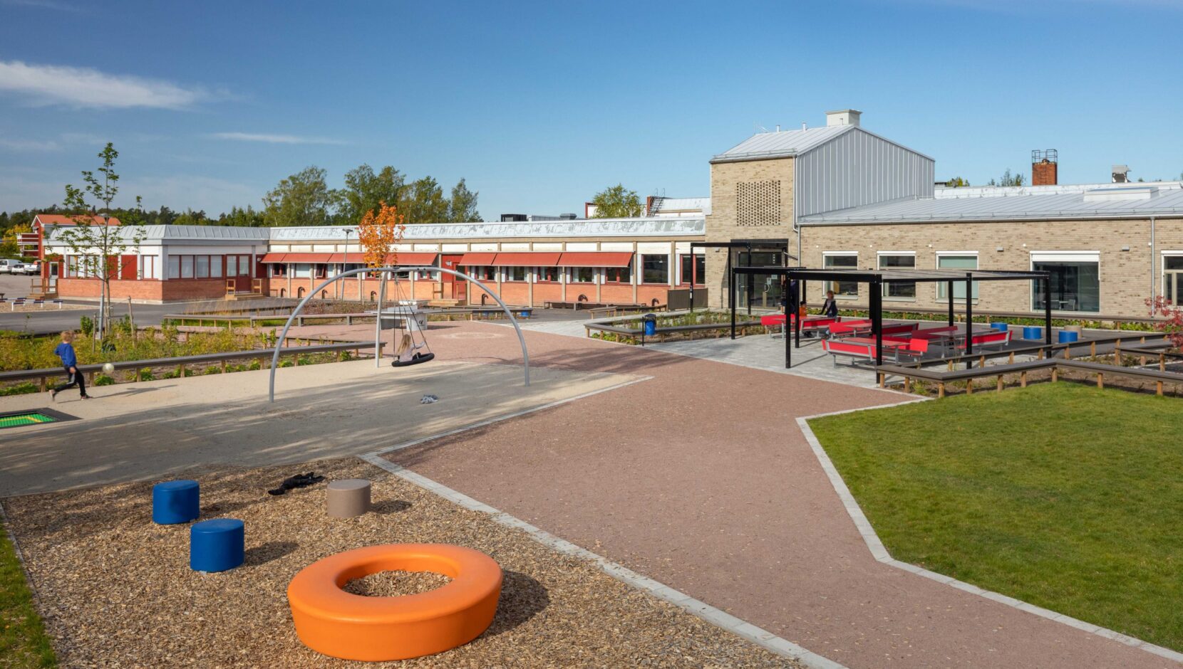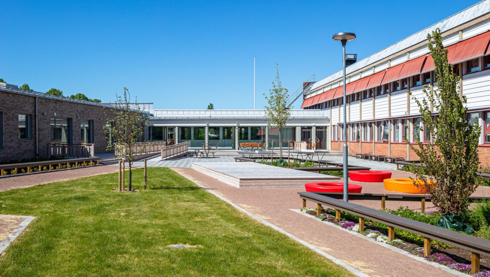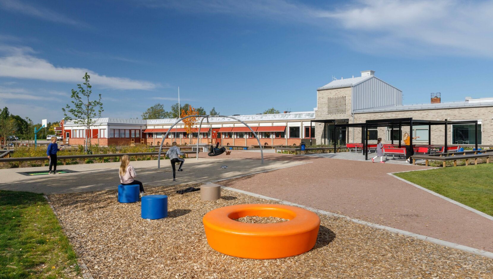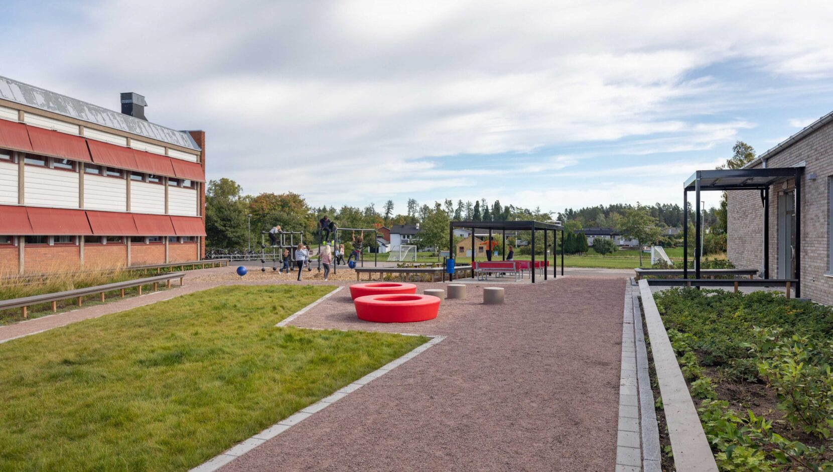 Archus landskapsarkitekter har utformat skolgården och utemiljön i dialog med skolans elever. Detta har resulterat i en demokratisk skolgård, som passar alla — från rofyllda platser att läsa böcker till mer aktiva platser innehållande lekpark och klätterställning. Ett av projektets utmaningar har varit att sy ihop det befintliga med det nya. För att svara upp mot de höjdskillnader som uppstått i samband med uppförandet, har utemiljön knutits samman med ett trädäck som ger skolgården en mer tongivande samlingsplats.