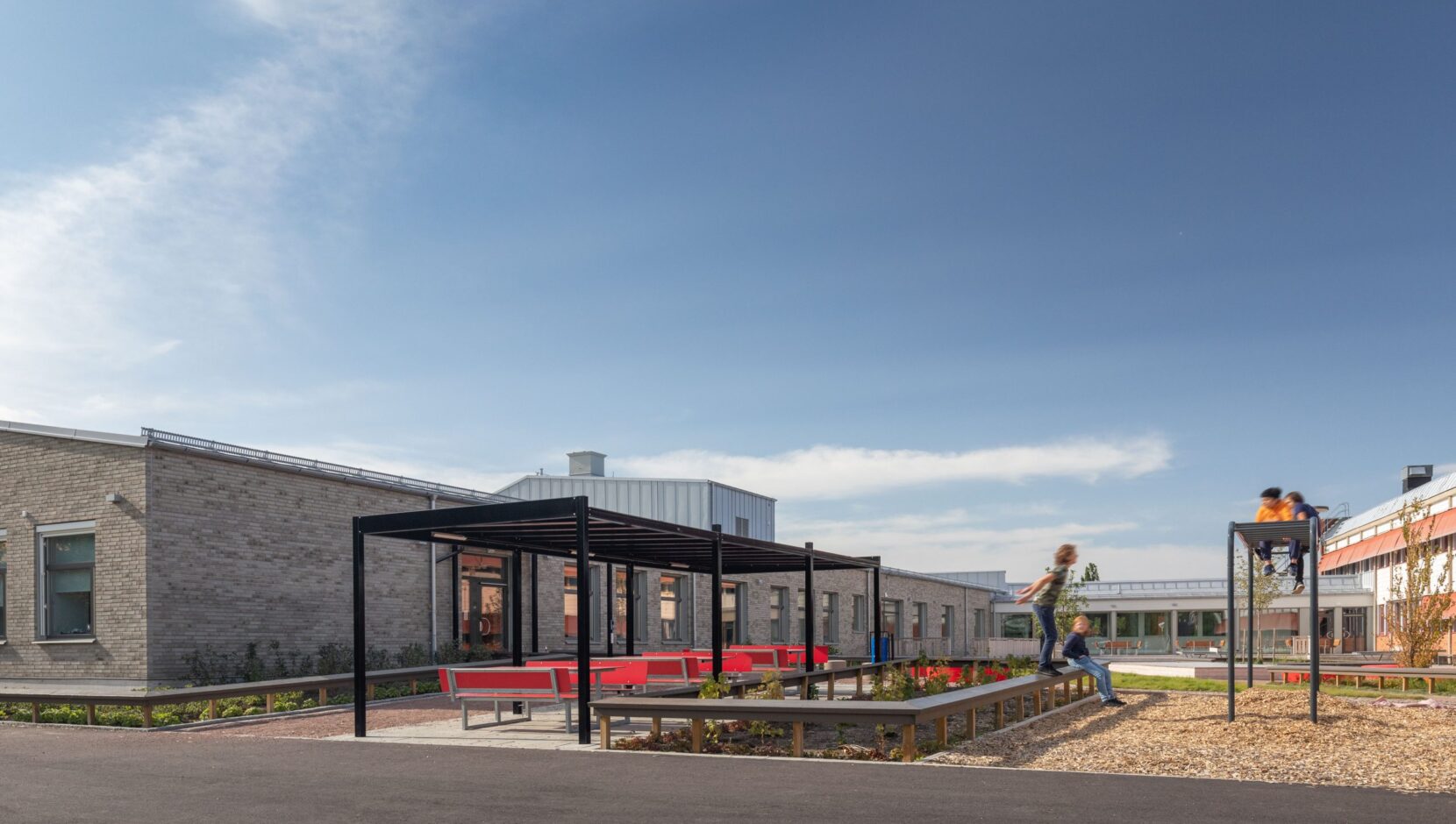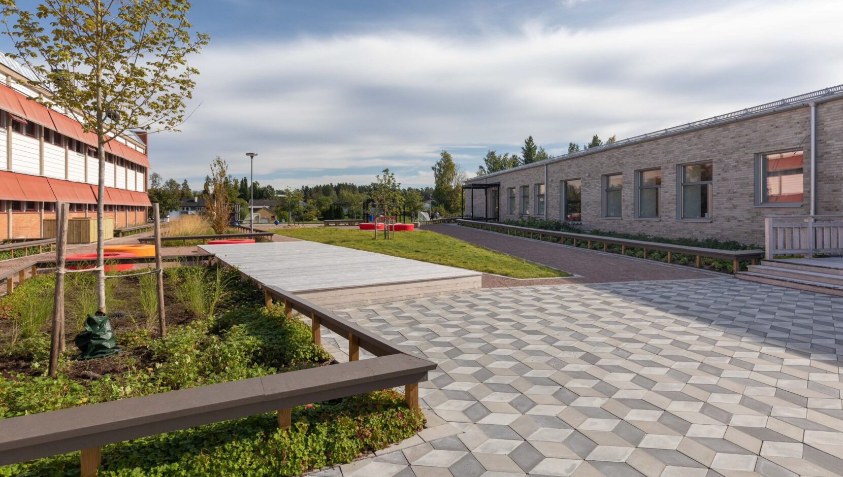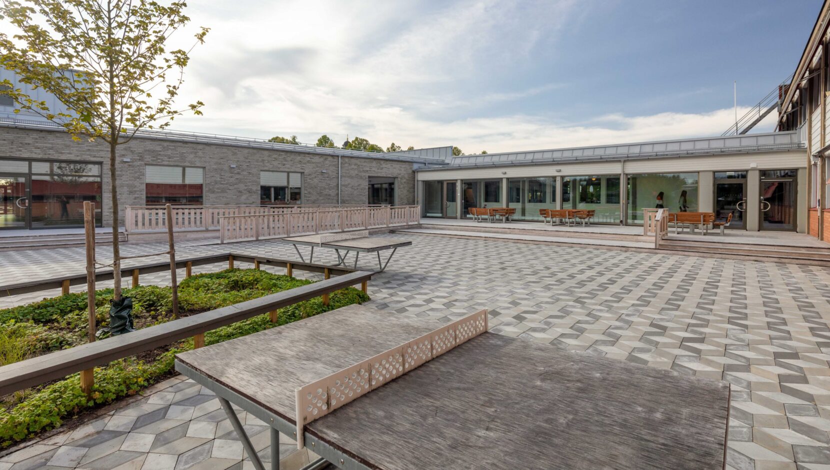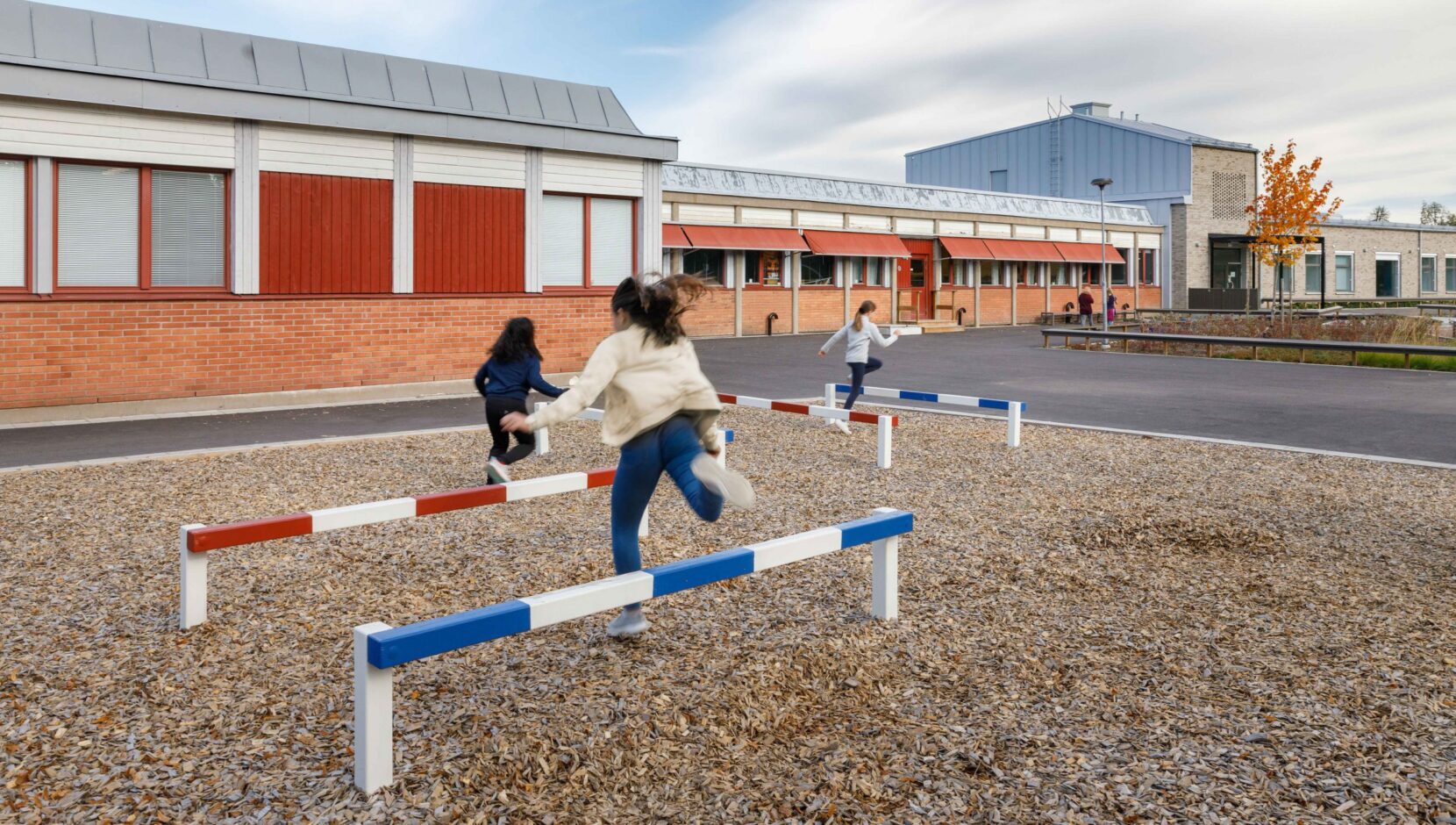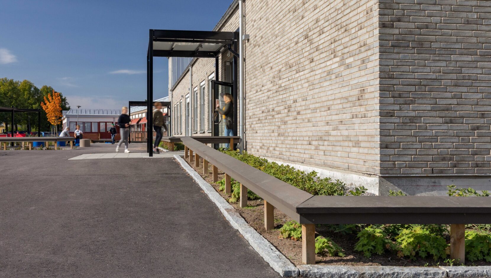 Archus landskapsarkitekter har utformat skolgården och utemiljön i dialog med skolans elever. Detta har resulterat i en demokratisk skolgård, som passar alla — från rofyllda platser att läsa böcker till mer aktiva platser innehållande lekpark och klätterställning. Ett av projektets utmaningar har varit att sy ihop det befintliga med det nya. För att svara upp mot de höjdskillnader som uppstått i samband med uppförandet, har utemiljön knutits samman med ett trädäck som ger skolgården en mer tongivande samlingsplats.