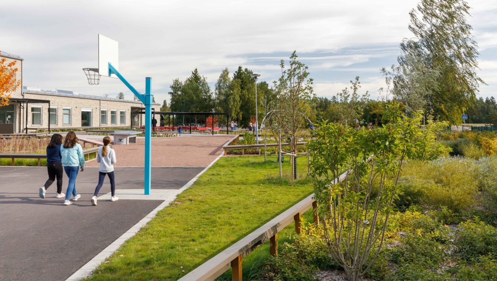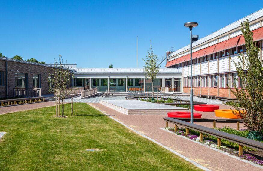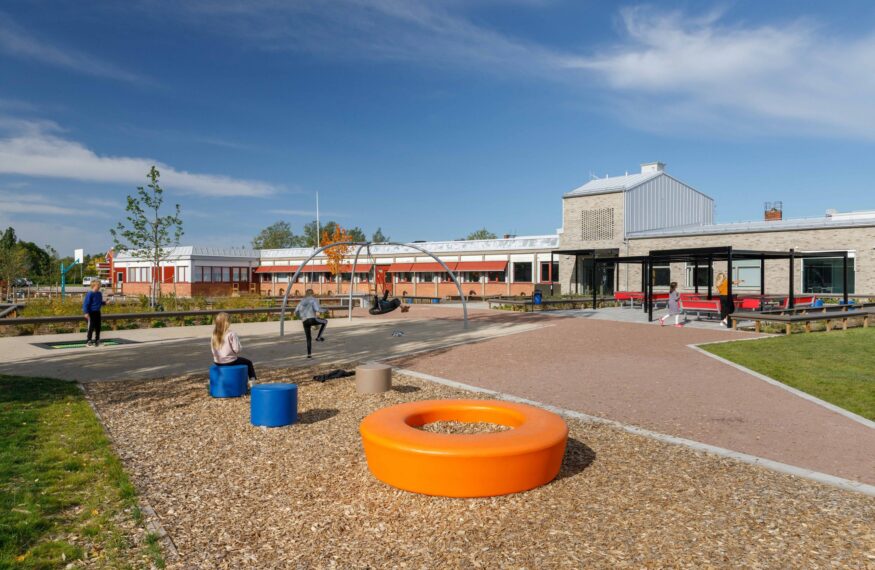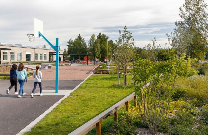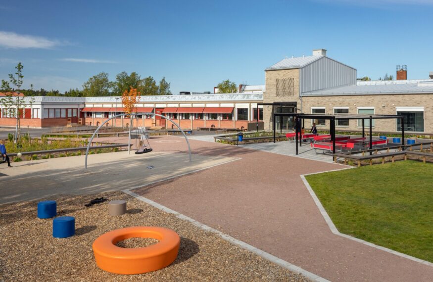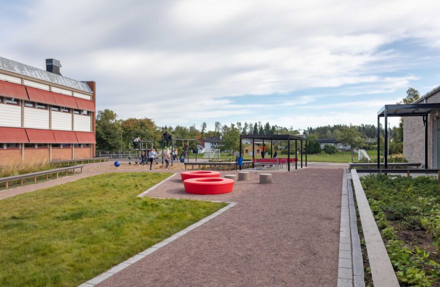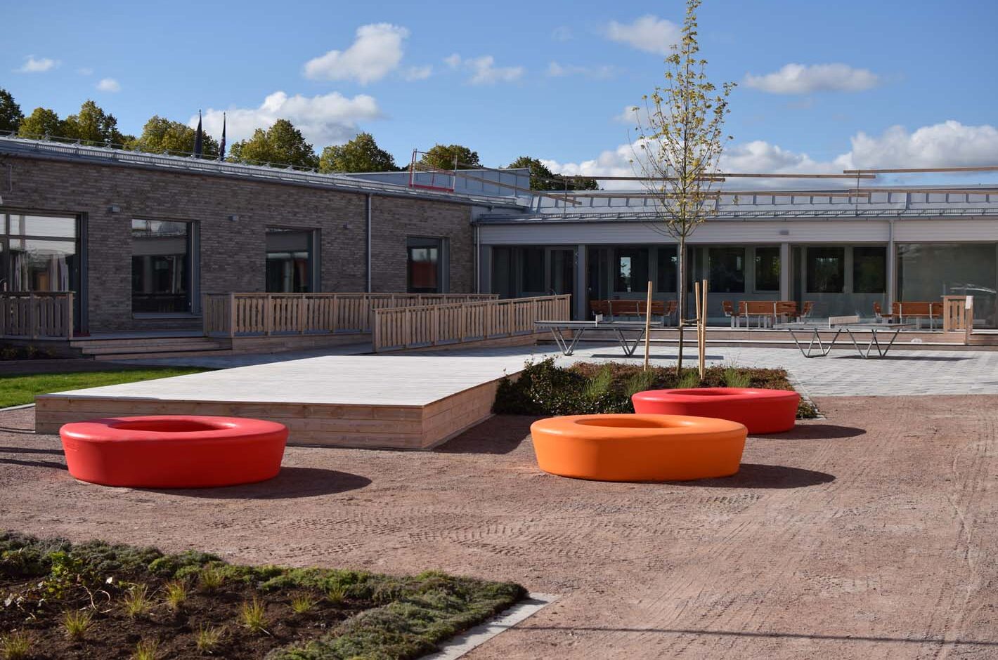 Archus landskapsarkitekter har utformat skolgården och utemiljön i dialog med skolans elever. Detta har resulterat i en demokratisk skolgård, som passar alla — från rofyllda platser att läsa böcker till mer aktiva platser innehållande lekpark och klätterställning. Ett av projektets utmaningar har varit att sy ihop det befintliga med det nya. För att svara upp mot de höjdskillnader som uppstått i samband med uppförandet, har utemiljön knutits samman med ett trädäck som ger skolgården en mer tongivande samlingsplats.