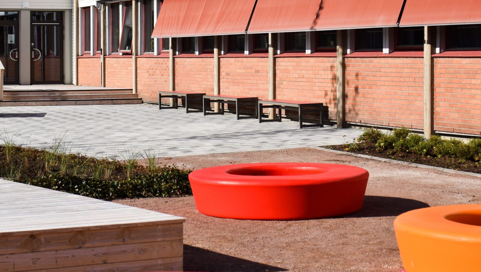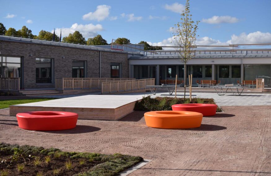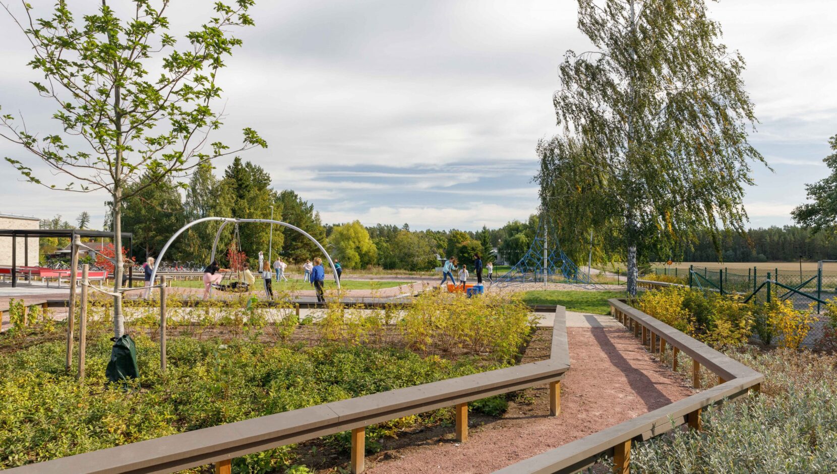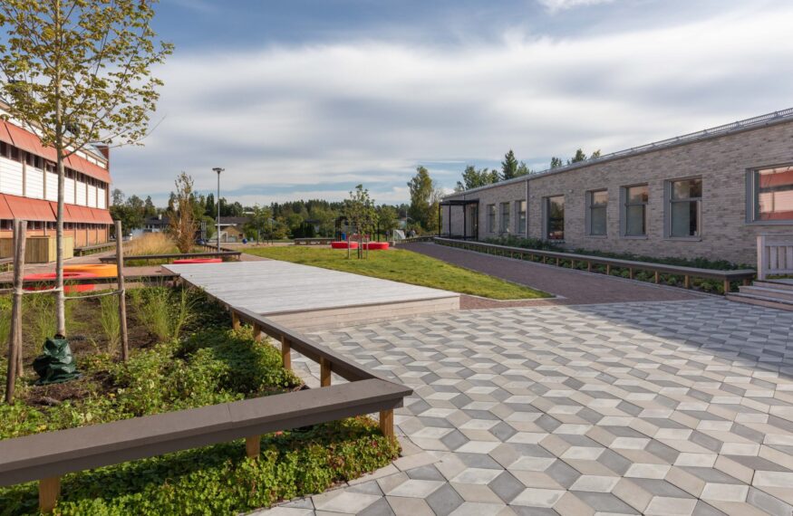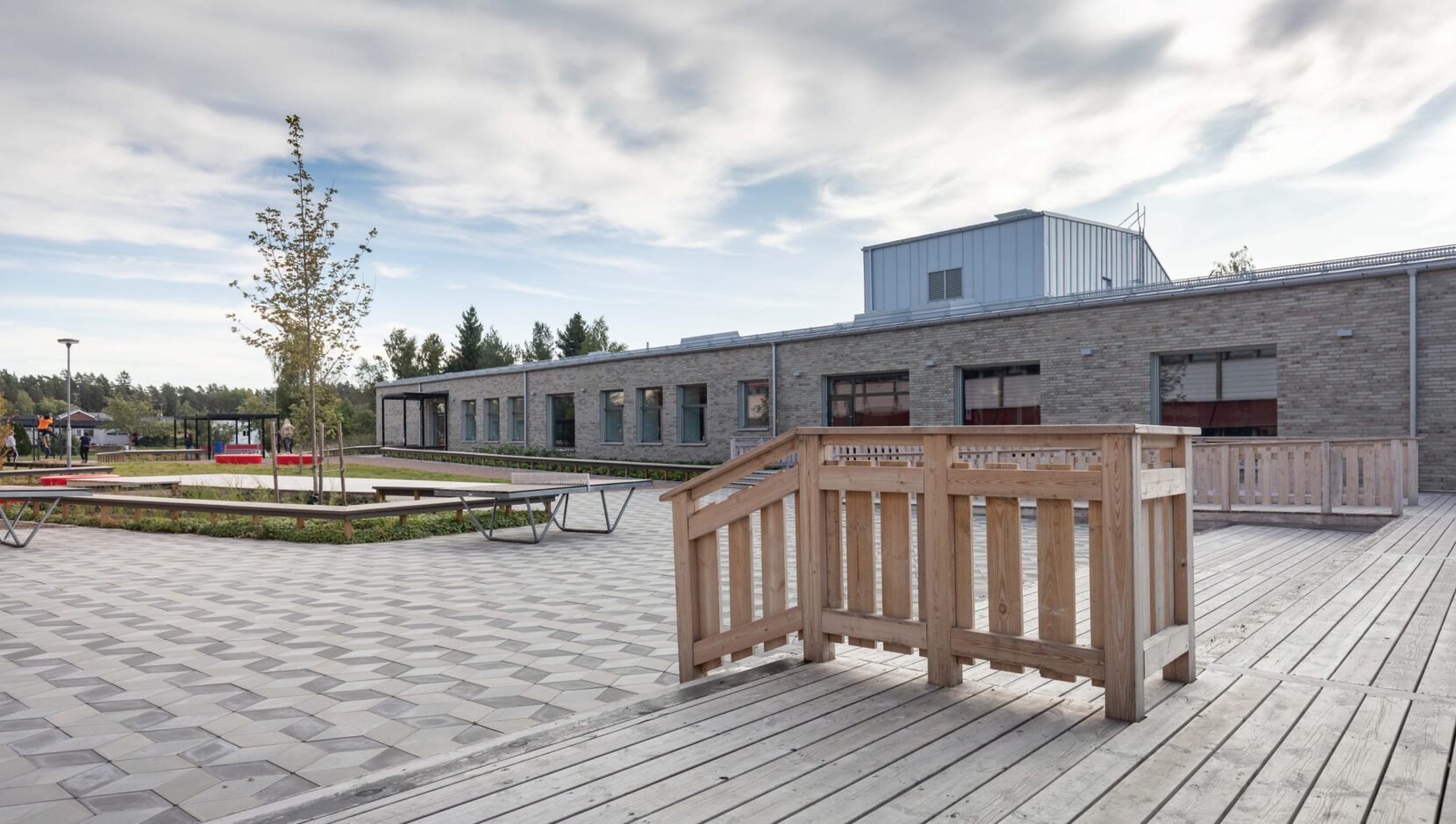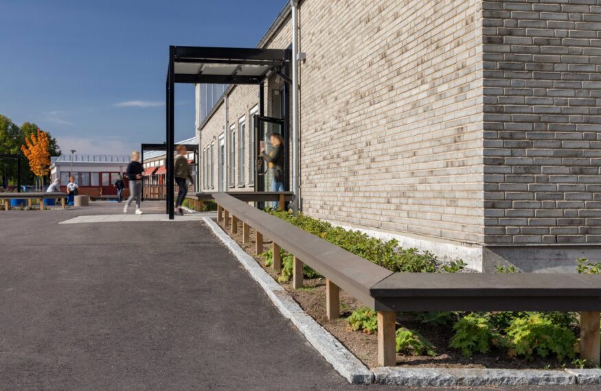 Archus landskapsarkitekter har utformat skolgården och utemiljön i dialog med skolans elever. Detta har resulterat i en demokratisk skolgård, som passar alla — från rofyllda platser att läsa böcker till mer aktiva platser innehållande lekpark och klätterställning. Ett av projektets utmaningar har varit att sy ihop det befintliga med det nya. För att svara upp mot de höjdskillnader som uppstått i samband med uppförandet, har utemiljön knutits samman med ett trädäck som ger skolgården en mer tongivande samlingsplats.