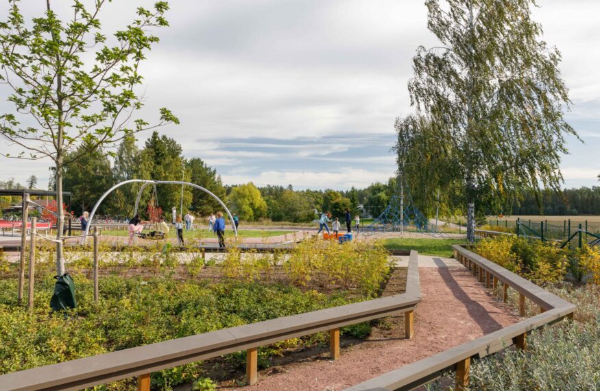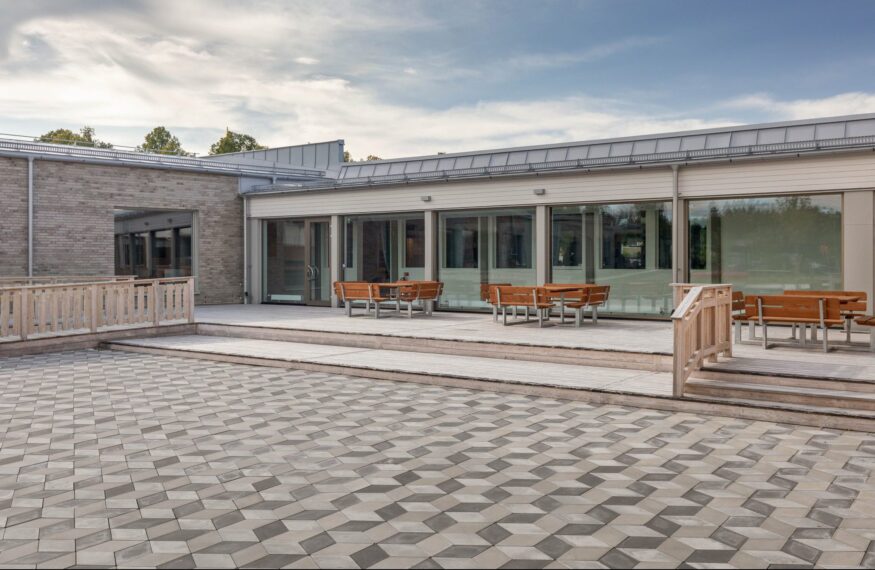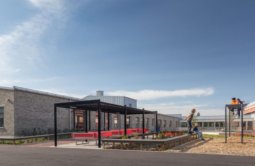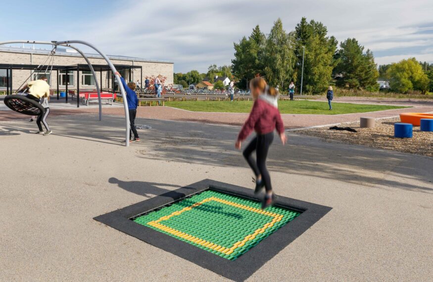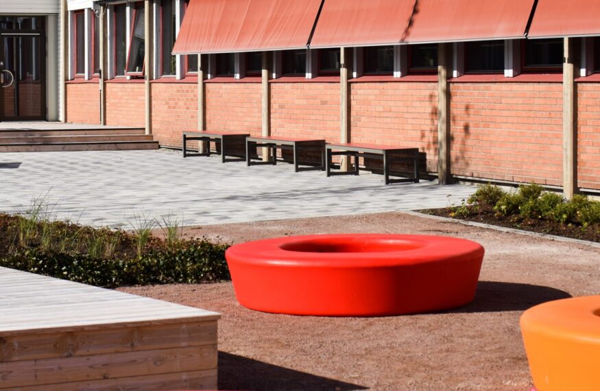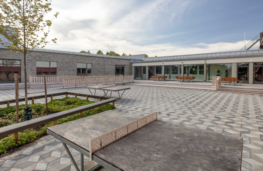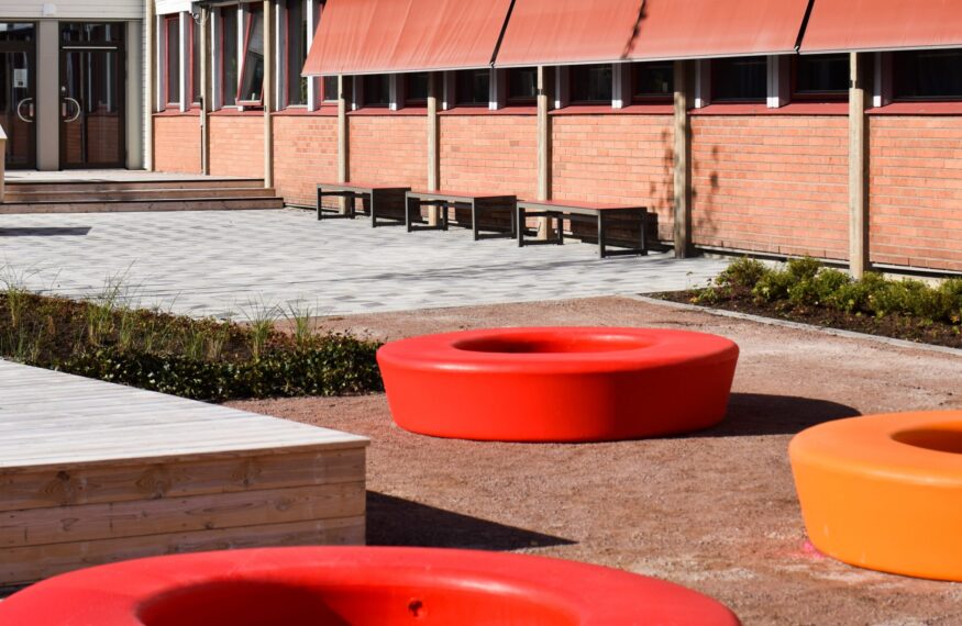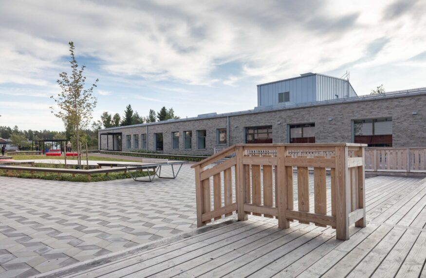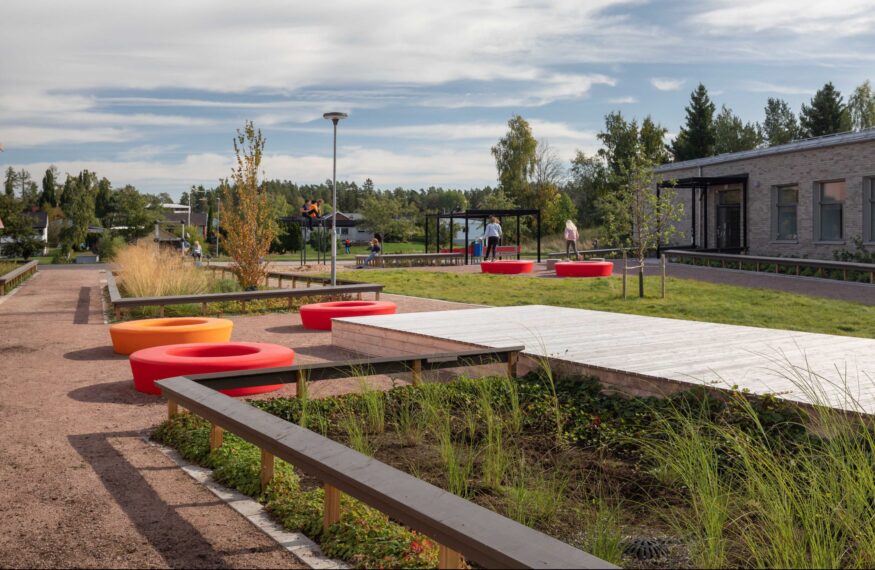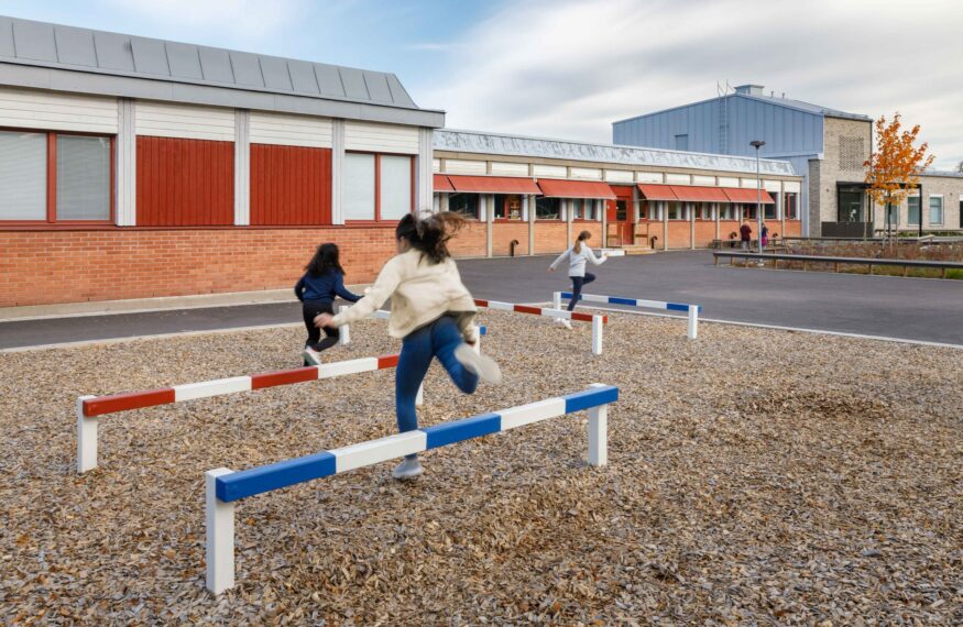 Archus landskapsarkitekter har utformat skolgården och utemiljön i dialog med skolans elever. Detta har resulterat i en demokratisk skolgård, som passar alla — från rofyllda platser att läsa böcker till mer aktiva platser innehållande lekpark och klätterställning. Ett av projektets utmaningar har varit att sy ihop det befintliga med det nya. För att svara upp mot de höjdskillnader som uppstått i samband med uppförandet, har utemiljön knutits samman med ett trädäck som ger skolgården en mer tongivande samlingsplats.