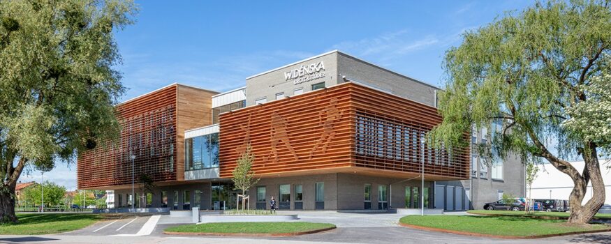 Widénska gymnasiets utformning återspeglar skolans identitet och särart. Lokalerna för idrott, med bland annat en 40 meter lång löparbana, är utlyfta ur volymen som stora träboxar och på de täta delarna av dessa finns träreliefer av atleter inom olika sporter. Byggnadens grundform är en kvadrat med sidan 44 meter och tre våningar. Tack vare den kompakta byggnadsformen skapas en närhet mellan alla delar av verksamheten.